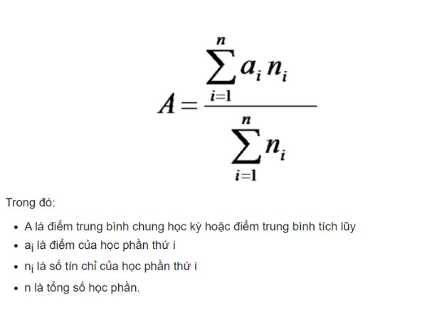 Điểm trung bình học kỳ, năm học, và điểm trung bình tích lũy được tính dựa trên công thức sau đây và sẽ được làm tròn đến hai chữ số thập phân: